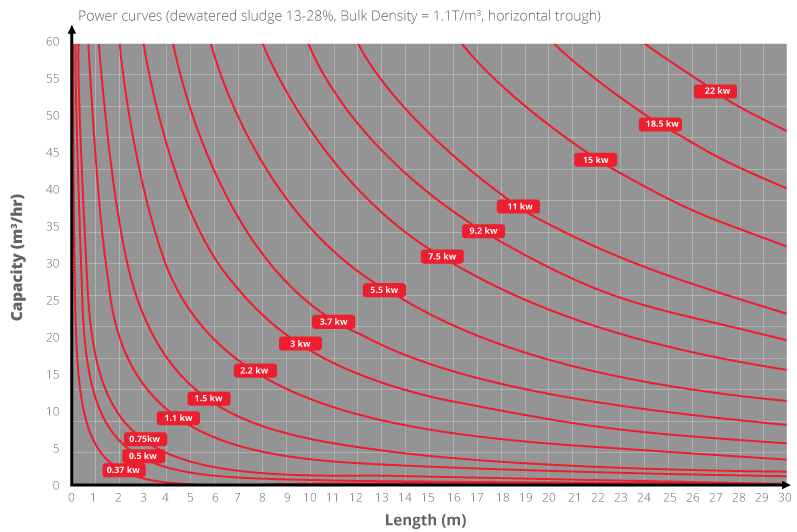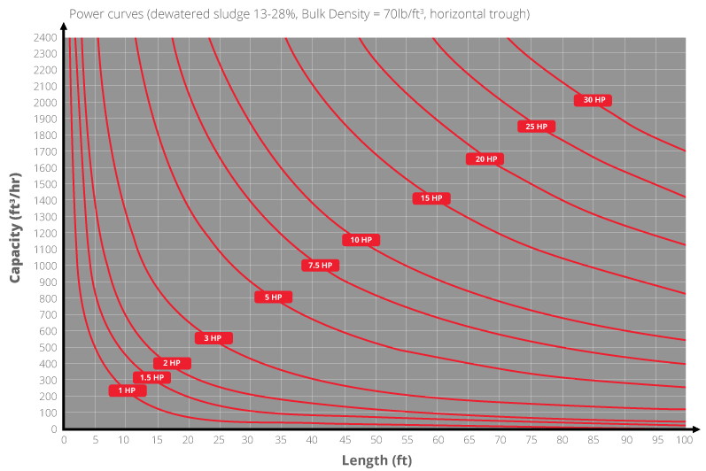 When designing a sludge conveyor system, a combination of factors need to be considered when sizing the trough, spiral and drive motor/gearbox: