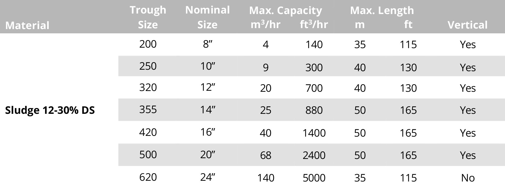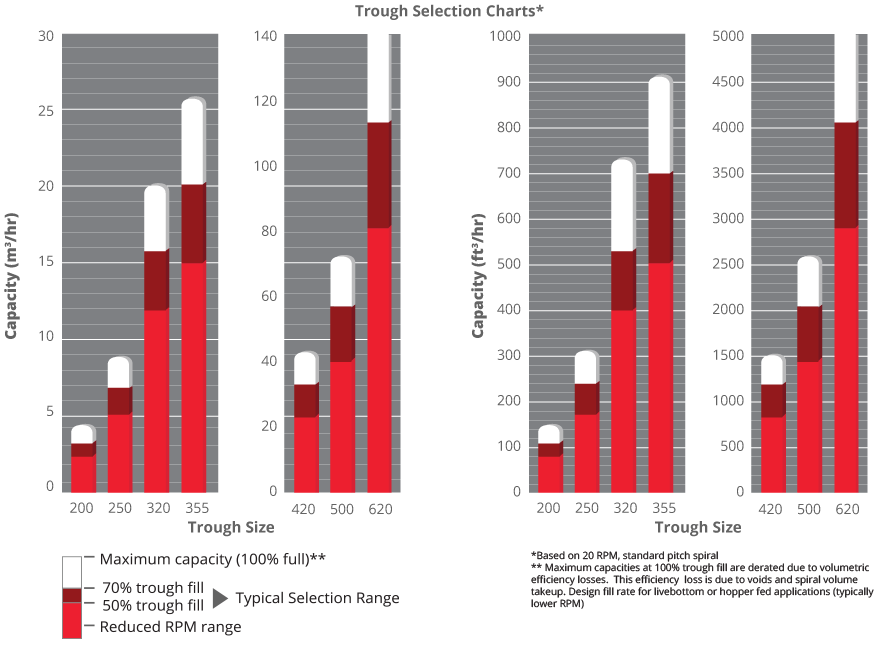 * Maximum Capacity is for horizontal applications only and can't be coincident with maximum length (Based on 20 RPM for sludge). Higher capacities may be achieved with higher RPM.